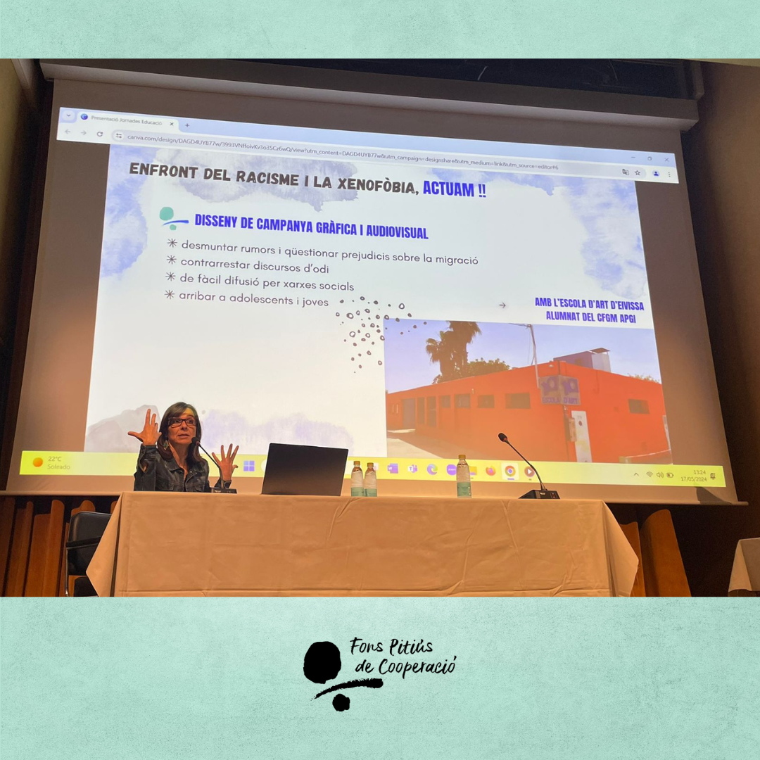 Beatriz de Astorza, tècnica d’Educació del Fons, va presentar la campanya gràfica i audiovisual que ha realitzat l’alumnat d’APGI de l’Escola d’Art d’Eivissa per a la nostra campanya ENFRONT DEL RACISME I LA XENOFÒBIA, ACTUAM! Així mateix, es va parlar de tota la feina i activitats que estem fent en educació entorn dels procesos migratoris i la cultura de pau. Entre elles, les formacions per a professsorat de Jordi Armadans (Fundipau), Catalina Nebot (La ce trencada) i SOS Racisme Catalunya.